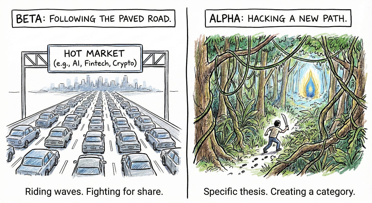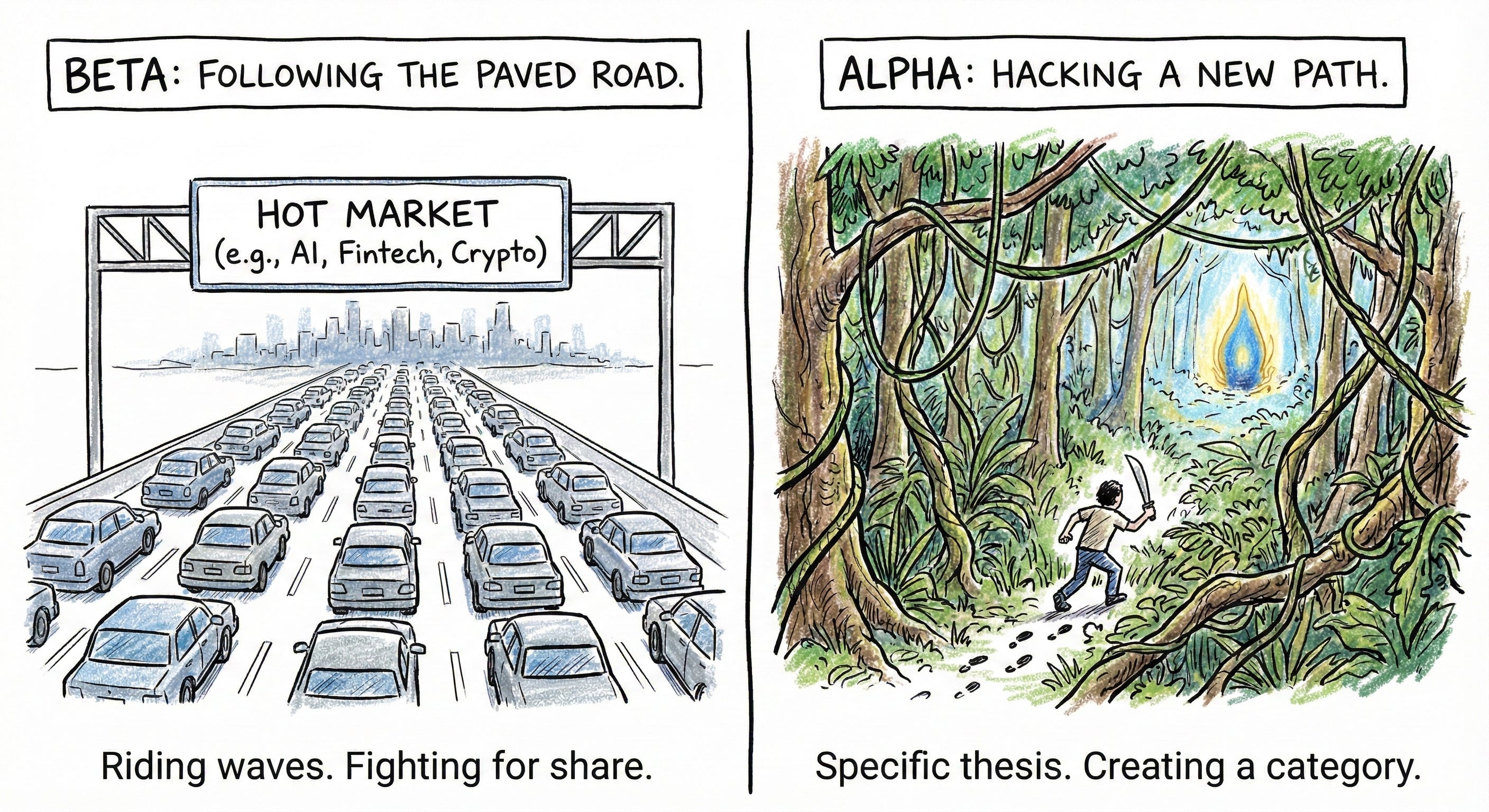 Alpha investors bet on a specific, contrarian view. Beta investors bet on broad market trends. The same distinction applies to startups.
